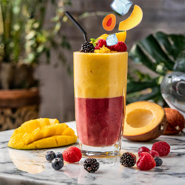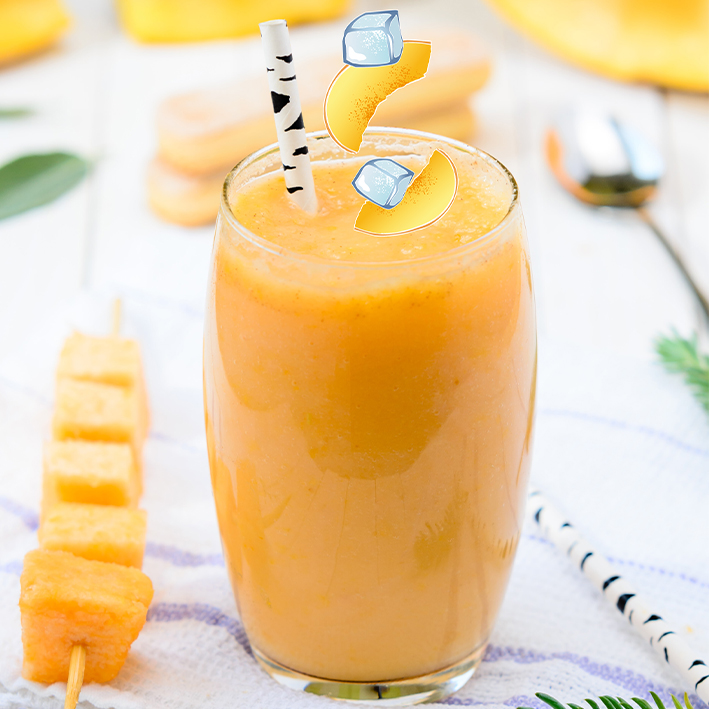Für 0,36 l: 160 ml Mangofruchtzubereitung mit 160 g Eiswürfeln mixen.