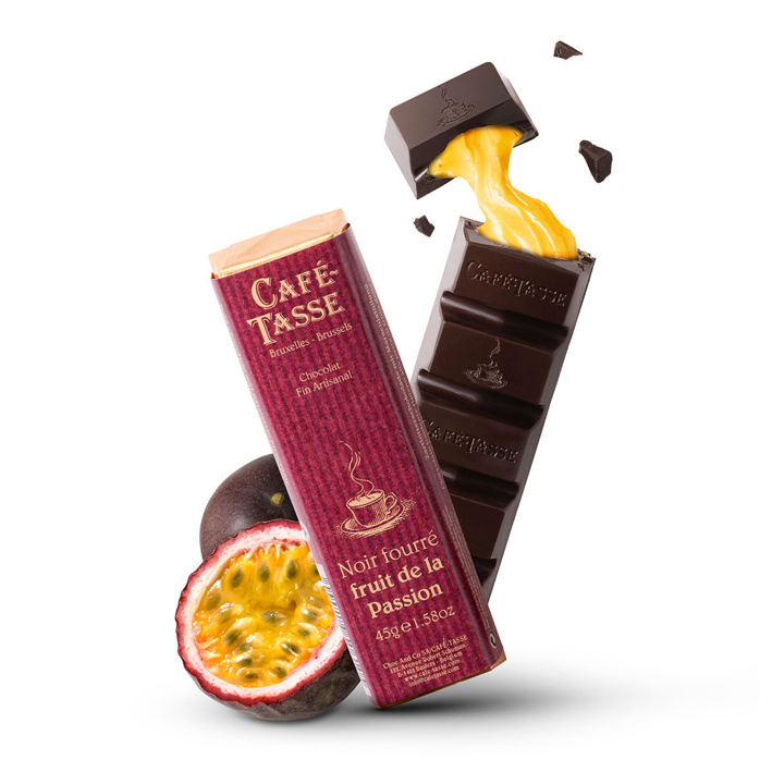Dieser Riegel besteht aus purer Zartbitterschokolade (60 %) und einer fruchtig-frischen Passionsfruchtcreme. Erhältlich im praktischen Verkaufsdisplay, ist er die ideale Kombination für Liebhaber von intensiver Schokolade und exotischer Frucht.