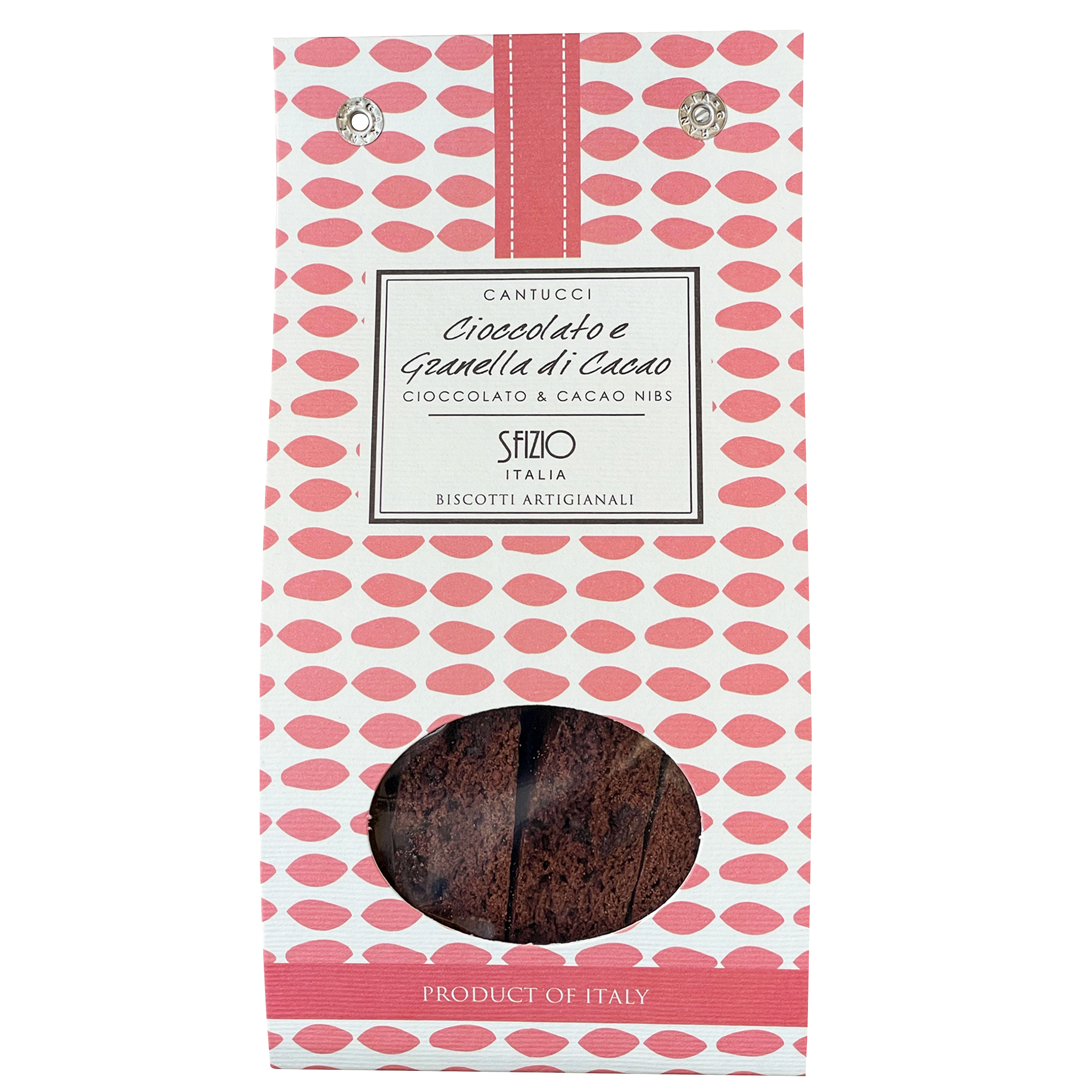 Italienische Cantucci, leicht und schokoladig, hergestellt aus italienischem Weizen, 21 % Bitterschokolade und 3 % Kakaosplittern. Diese Variante ist etwas weicher als der traditionelle Keks und wird mit frischen Eiern und Butter aus der Region zu einem besonders reichhaltigen Genuss.