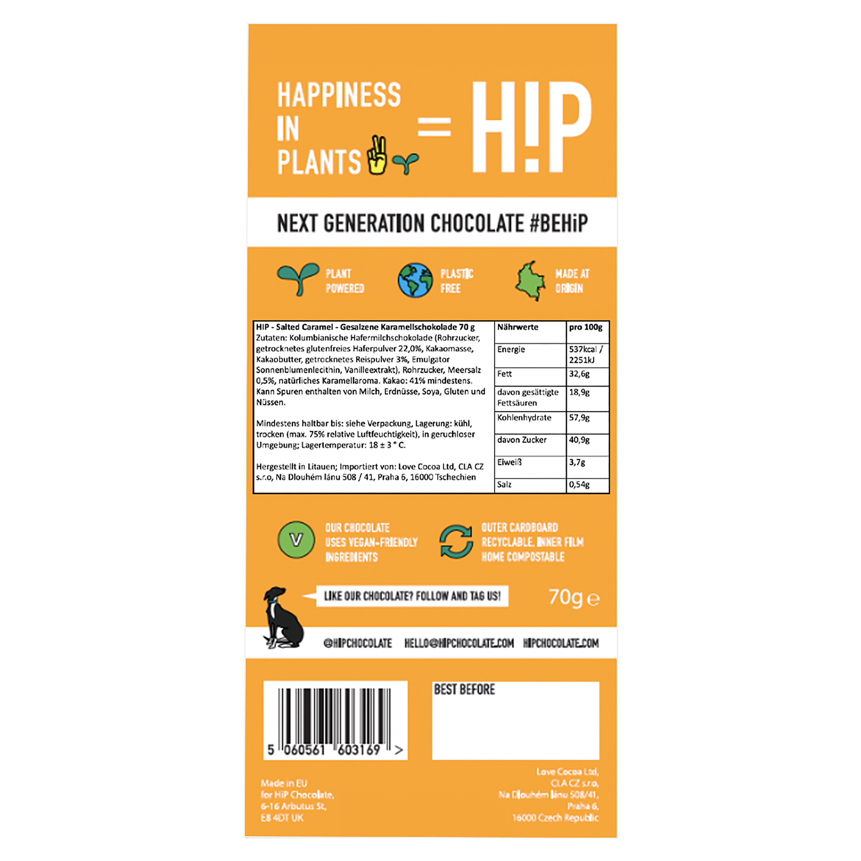 Schokoladenkuvertüre (Zucker, getrockneter glutenfreier HAFERsirup 25%, Kakaobutter, Kakaomasse, Emulgator: Sonnenblumenlecithin, Vanilleextrakt), Rohrzucker, Meersalz 0,5%, natürliches Karamellaroma. Kakao: 41 % mindestens.