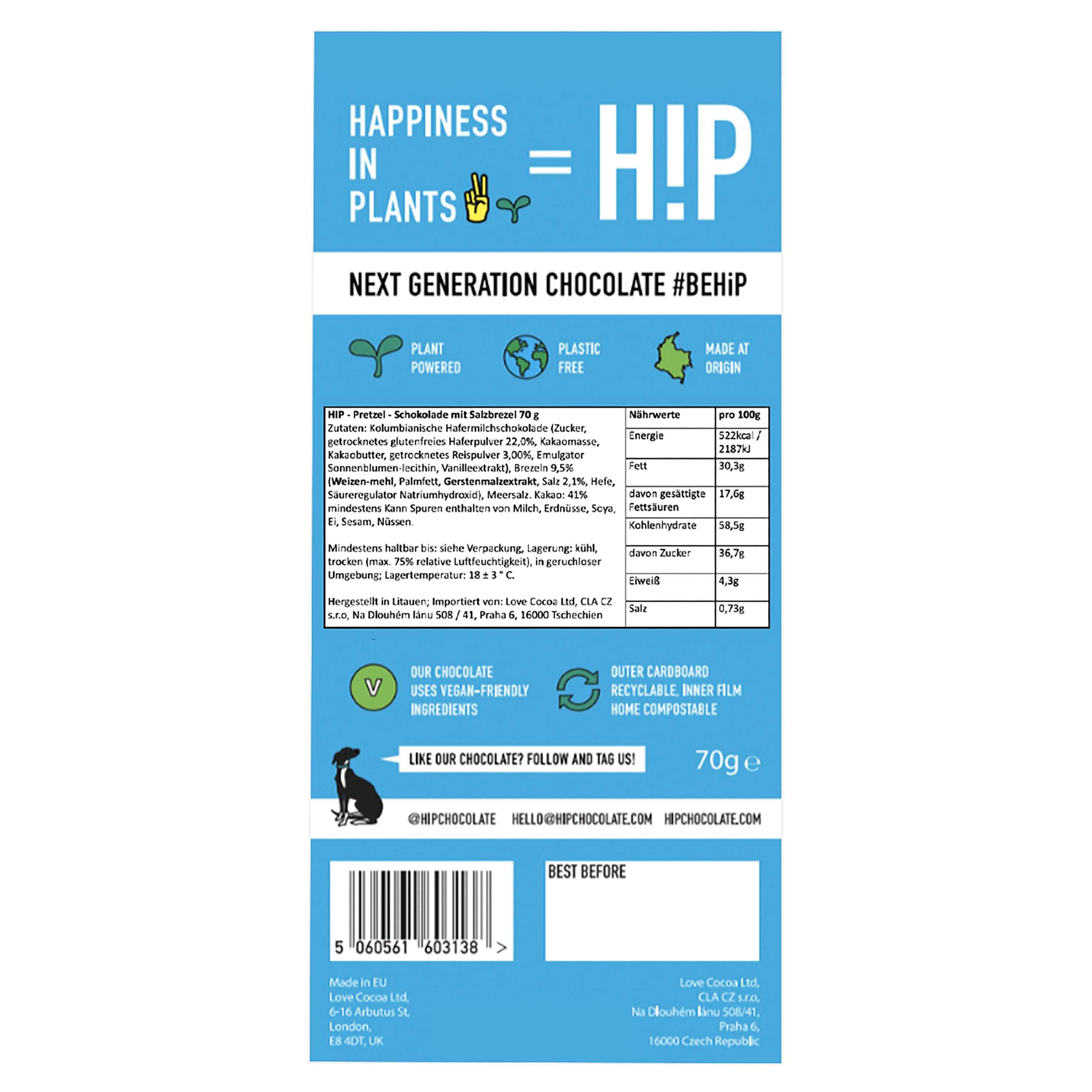 Kolumbianischer Kakao (41 %), kombiniert mit cremigem Haferbasis und gesalzenen Brezeln, schafft eine herzhafte und doch süße Geschmackssensation, die ihresgleichen sucht. Diese außergewöhnliche Schokolade von H!P ist nicht nur plastikfrei und 100 % vegan, sondern auch ein Genuss für den bewussten Schokoladenliebhaber. Die Mischung aus dem herben Kakaogeschmack und der salzigen Note der Brezeln sorgt für einen spannenden Kontrast, der jeden Bissen aufregend macht. Perfekt als Snack oder als besondere Leckerei nach einem langen Tag.