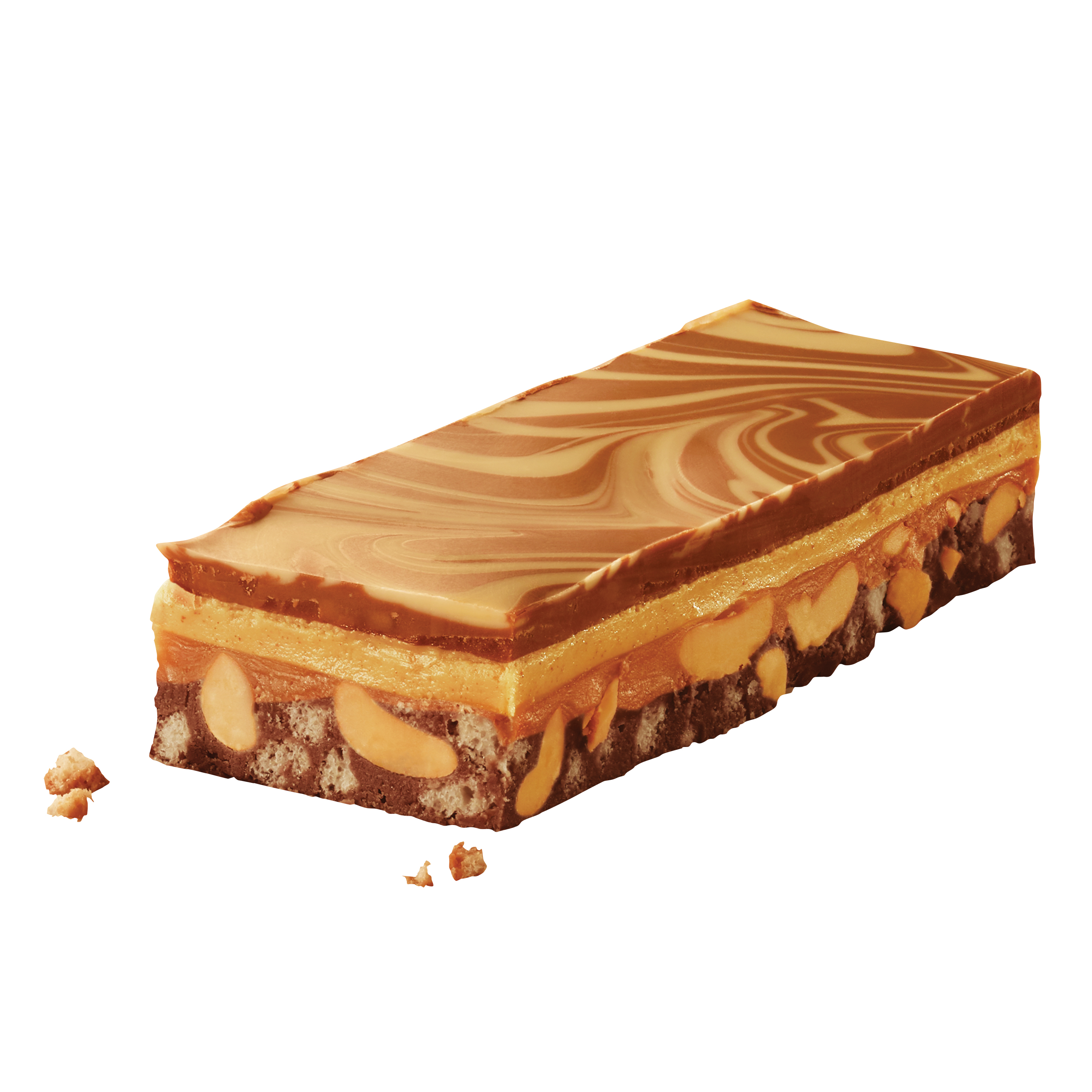 Milchschokolade (39%) (Zucker, Kakaobutter, VollMILCHpulver, Kakaomasse, Emulgator: SOJAlecithin, natürliches Vanillearoma), Karamell (gezuckerte kondensierte MagerMILCH (MagerMILCH, Zucker), Glukosesirup, Invertzuckersirup, Palmöl, Zucker, BUTTER, Feuchthaltemittel: Glycerin, Emulgator: Mono- und Diglyceride von Speisefettsäuren, Stabilisator: Pektin, natürliches Aroma, Salz), ERDNUSSpaste (13%), gebrannte ERDNÜSSE (11%), weiße Schokolade (8%) [Zucker, Kakaobutter, VollMILCHpulver, Emulgator: SOJAlecithin, natürliches Vanillearoma], Knusperreis (5%) [Reismehl, WEIZENmehl, Zucker, SüßMOLKENpulver (MILCH), GERSTENmalzextrakt, Salz, Rapsöl, Emulgator: SOJAlecithin], Palmöl, BUTTER, Rapsöl, Invertzuckersirup, Emulgator: Mono- und Diglyceride von Speisefettsäuren, Antioxidationsmittel: (stark tocopherolhaltige Extrakte, Ascorbylpalmitat). Kakao: 34% mindestens in der Milchschokolade.