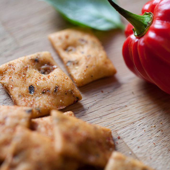 Feinste Salzgebäcke aus Hartweizengrieß, veredelt mit Olivenöl, aromatischen Gewürzen und Kräutern. Sie sind nicht frittiert, sondern knusprig ausgebacken und mit Tomate und Oregano fein abgeschmeckt. Ein mediterraner Snack für zwischendurch.