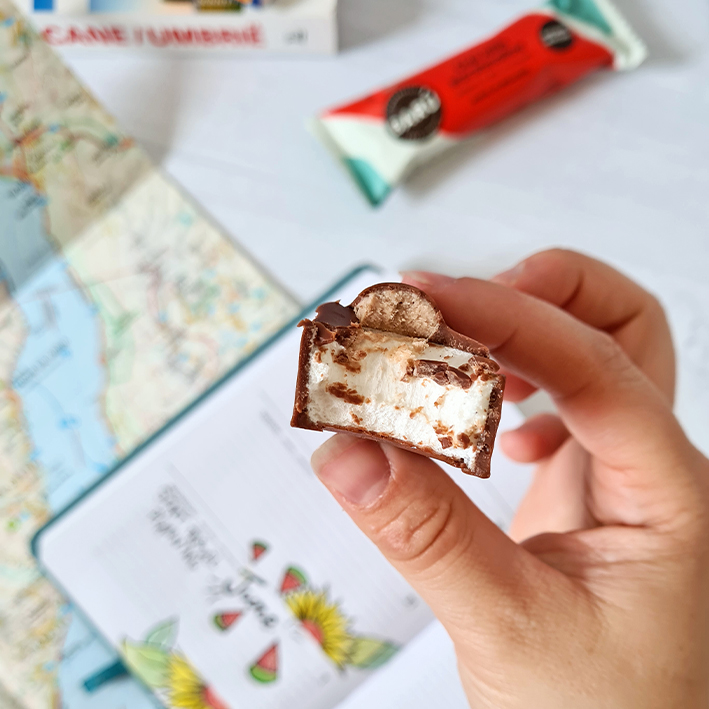 Ein luftiger Marshmallow, der mit einer cremigen Milchfüllung getoppt wird, verfeinert mit einer würzigen Prise Chaipulver - dieser Riegel vereint weiche und kräftige Aromen zu einem einzigartigen Geschmackserlebnis. Der warme und würzige Geschmack des Chais verleiht dem süßen Marshmallow eine exotische Note und macht diesen Riegel zu einem besonderen Snack für alle, die kräftige Gewürze in einer süßen Kombination genießen möchten.