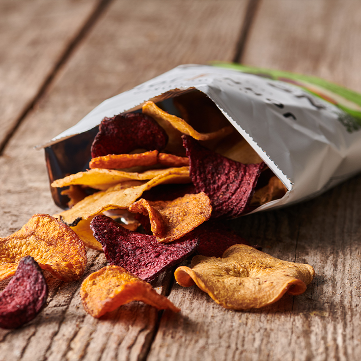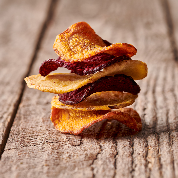 Durch das Vakuum-Frittieren gelingt es uns bei der Herstellung der Crisps die Temperaturen konstant niedrig zu halten. Diese Produktionstechnologie sorgt durch die geringere und ideale Temperatur dafür, dass die Crisps weniger Fett enthalten als bei Normaldruck frittierte Knabberartikel, da das Wasser aus den Kartoffeln schneller verdampft, bis sich eine leckere Kruste und die typischen Röstaromen entwickeln. Weniger Fett, weniger Acrylamid. Die Farbe der Crisps ist natürlicher, der Geschmack ist intensiver und die Kruste knuspriger.