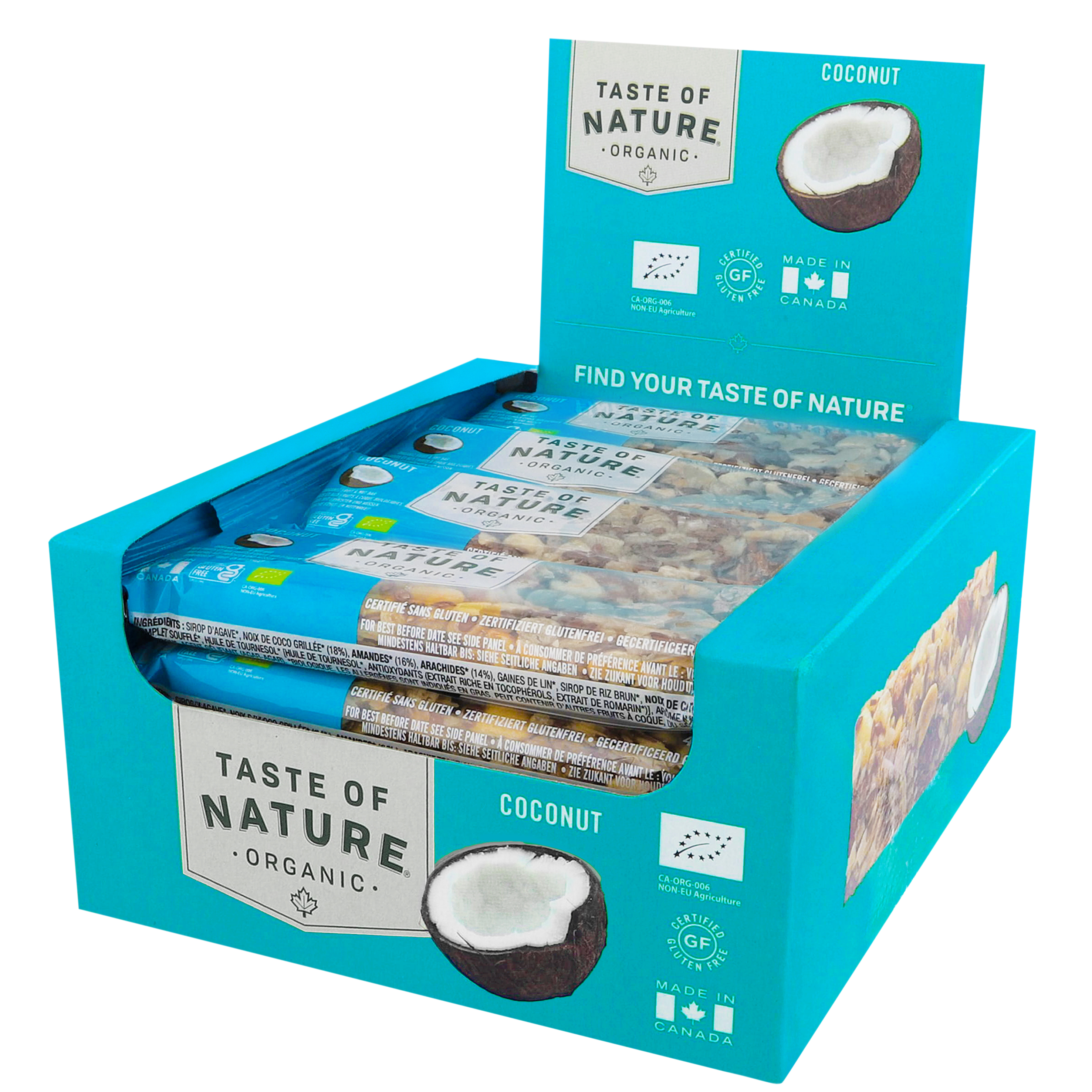 Agavensirup*, geröstete Kokosraspeln* (18%), MANDELN* (16 %), ERDNÜSSE* (14 %), Leinsamen*, brauner Reissirup*, CASHEWNÜSSE* (8 %),Vollkorn-Puffreis*, Sonnenblumenölmischung* (Sonnenblumenöl*, Antioxidationsmittel: Tocopherolhaltiger Extrakt (E306), Rosmarinextrakt*), natürliche Aromastoffe*, Zitronenöl*, Geliermittel: Agar-Agar (E406). *Aus kontrolliert biologischem Anbau.