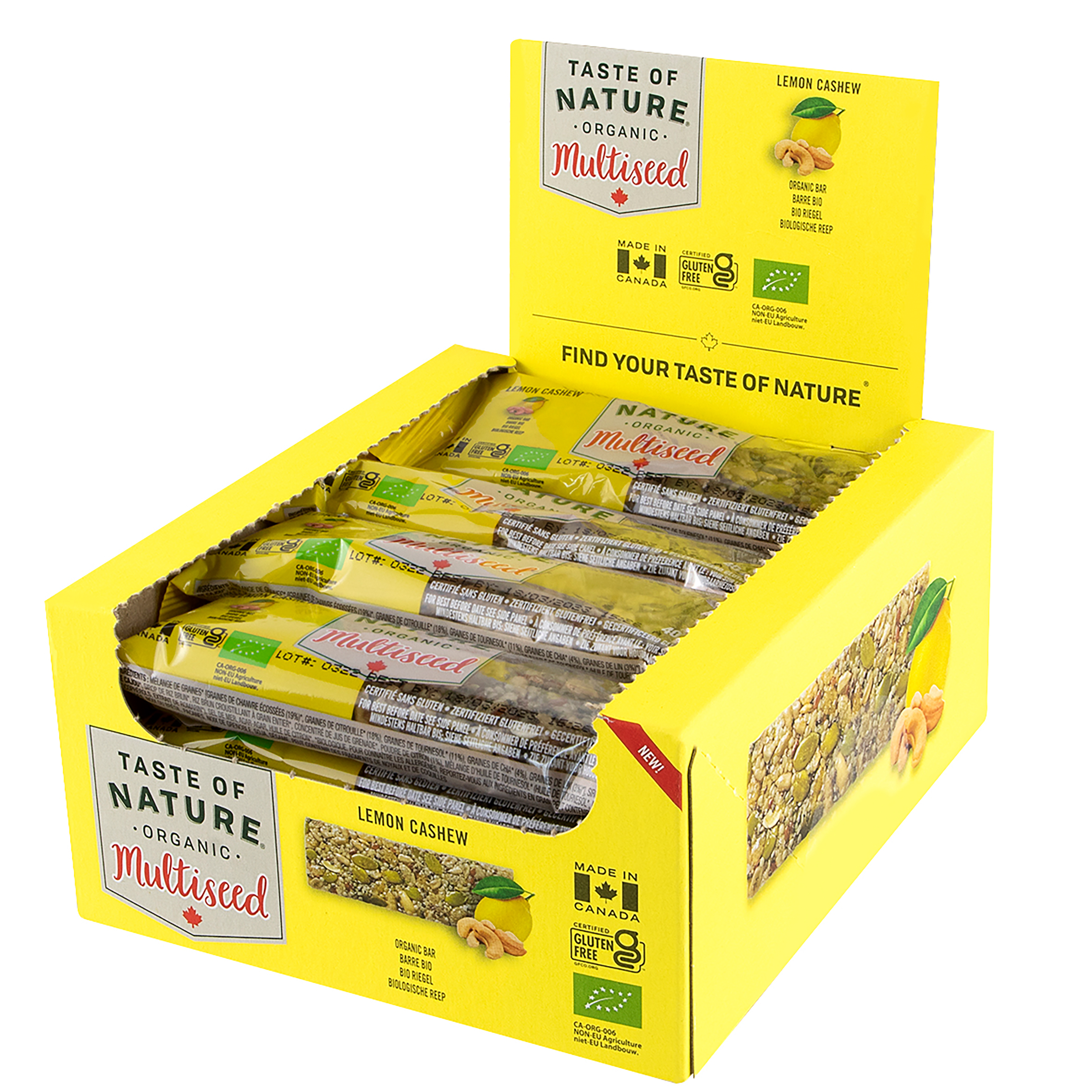 Samenmischung* [Geschälte Hanfsamen* (19%), Kürbiskerne* (18%), Sonnenblumenkerne* (11%), Chiasamen* (4%), Leinsamen* (3%)], Agavendicksaft*, CASHEWNÜSSE* (12%), brauner Reissirup*, Vollkornknusperreis*, Granatapfelsaftkonzentrat*, Zitronenpulver (1%), Sonnenblumenölmischung* [Sonnenblumenöl*, Antioxidationsmittel (Stark Tocopherolhaltige Extrakte, Extrakt aus Rosmarin *)], Meersalz, Geliermittel (Agar-Agar), Zitronenöl*. *Aus kontrolliert biologischem Anbau. Kann Teile von Kernen und Schalen enthalten.