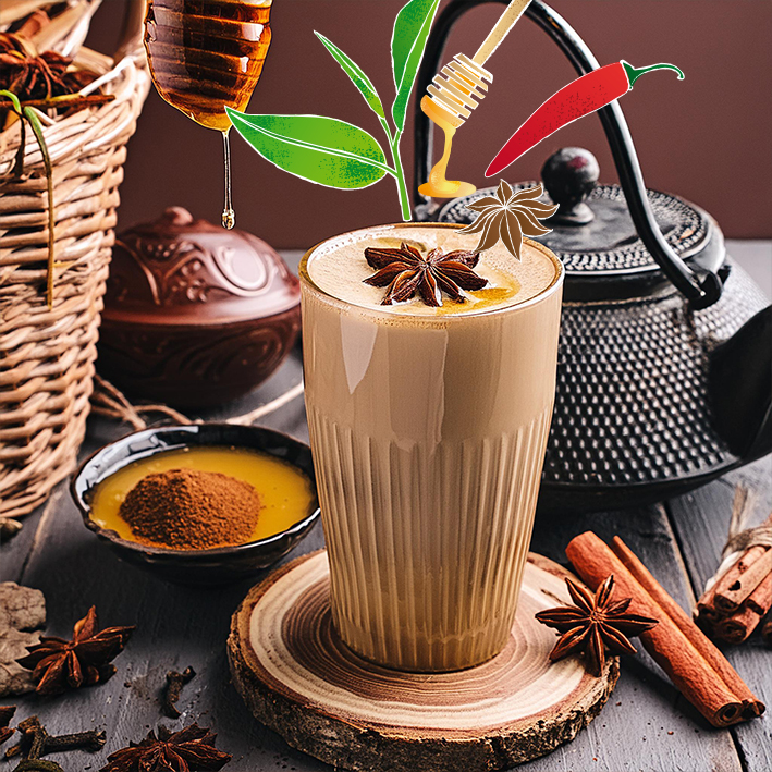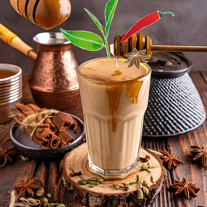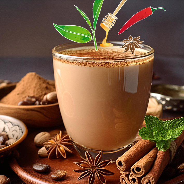 Zucker, Maltodextrin, Dextrose, Kartoffelstärke, Schwarzteeextrakt 6 %, Honigpulver, natürliche Aromen, Gewürze 4 % (Nelke, Ingwer, Zimt, Kardamom, Cayennepfeffer, Fenchel, Anis), Salz.