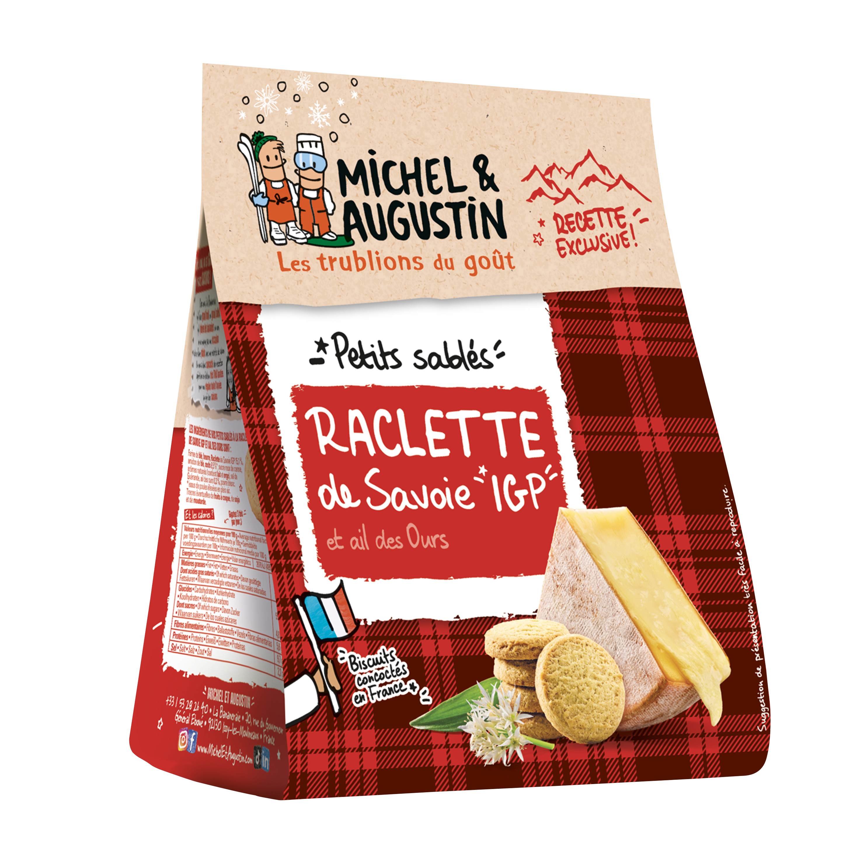 WEIZENMEHL, BUTTER (MILCH) 25,6%, Raclette de Savoie IGP 15,1%, WEIZENstärke, EIER 6,5%*, brauner Rohrzucker, natürliches Aroma (enthält MILCH und GERSTE), Sel de Guérande (Salz), Bärlauch 0,3%, weißer Pfeffer. *aus Freilandhaltung