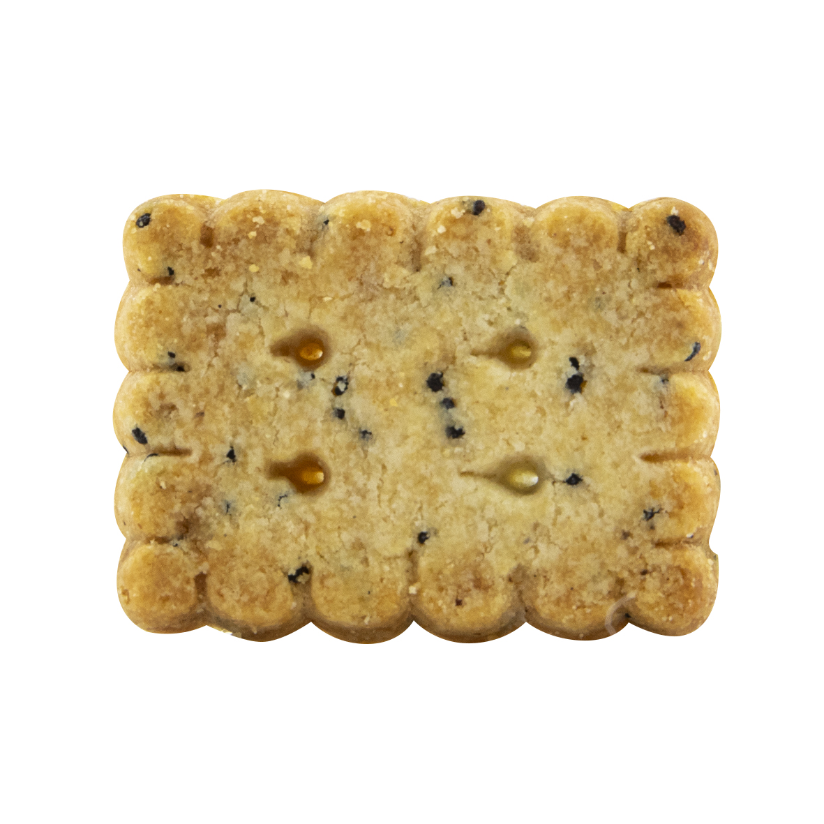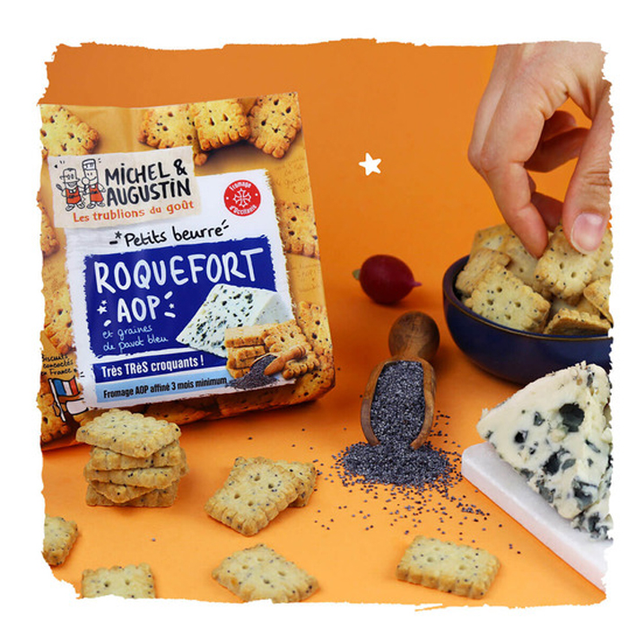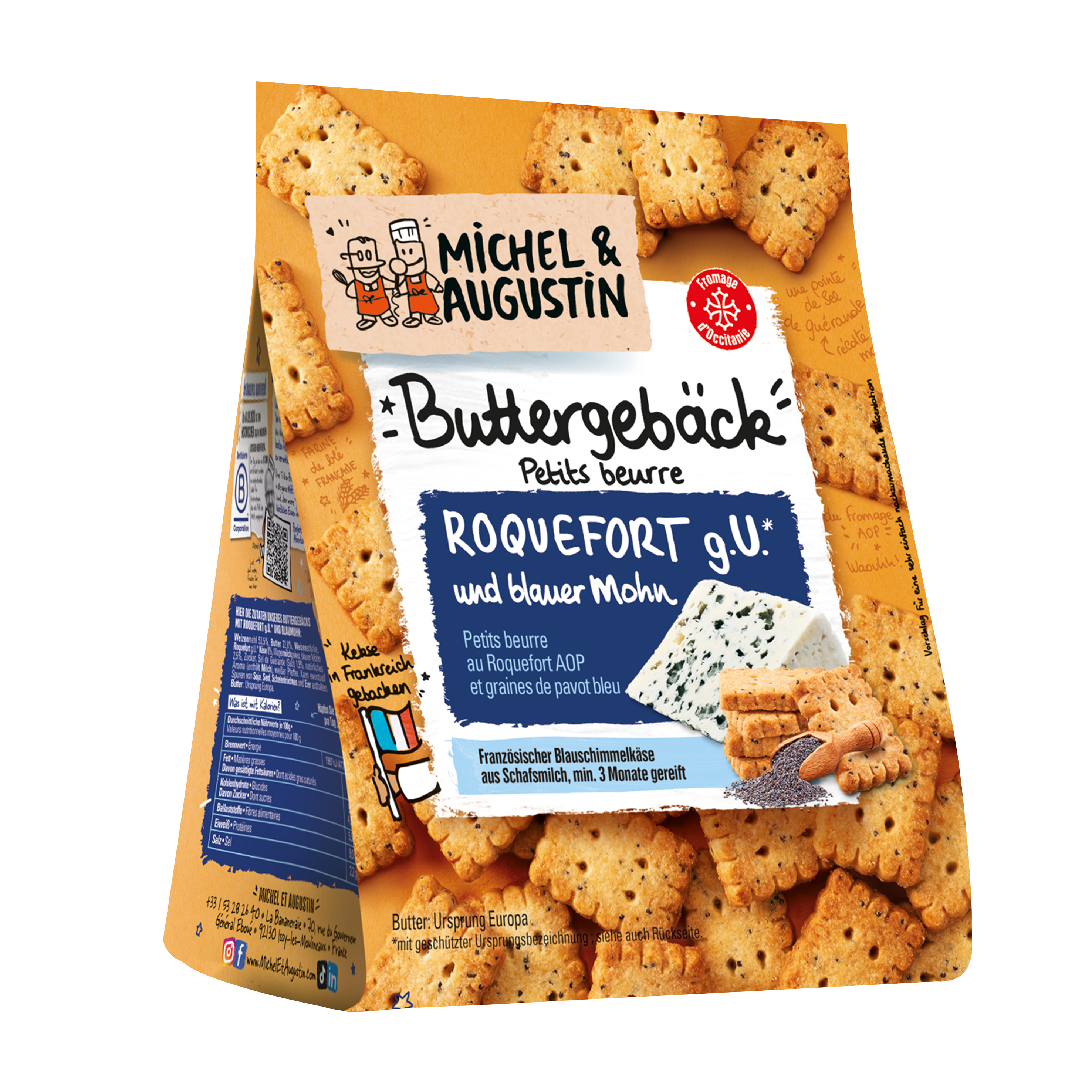 WEIZENMEHL, BUTTER (Herkunft aus der EU) 22.8%, WEIZENSTÄRKE, KÄSE (Roquefort g.U.) 8%, MAGERMILCHPULVER, blauer Mohn 2.5%, Zucker, Meersalz (Sel de Guérande) 1.9%, natürliches Aroma (enthält MILCH), weißer Pfeffer.