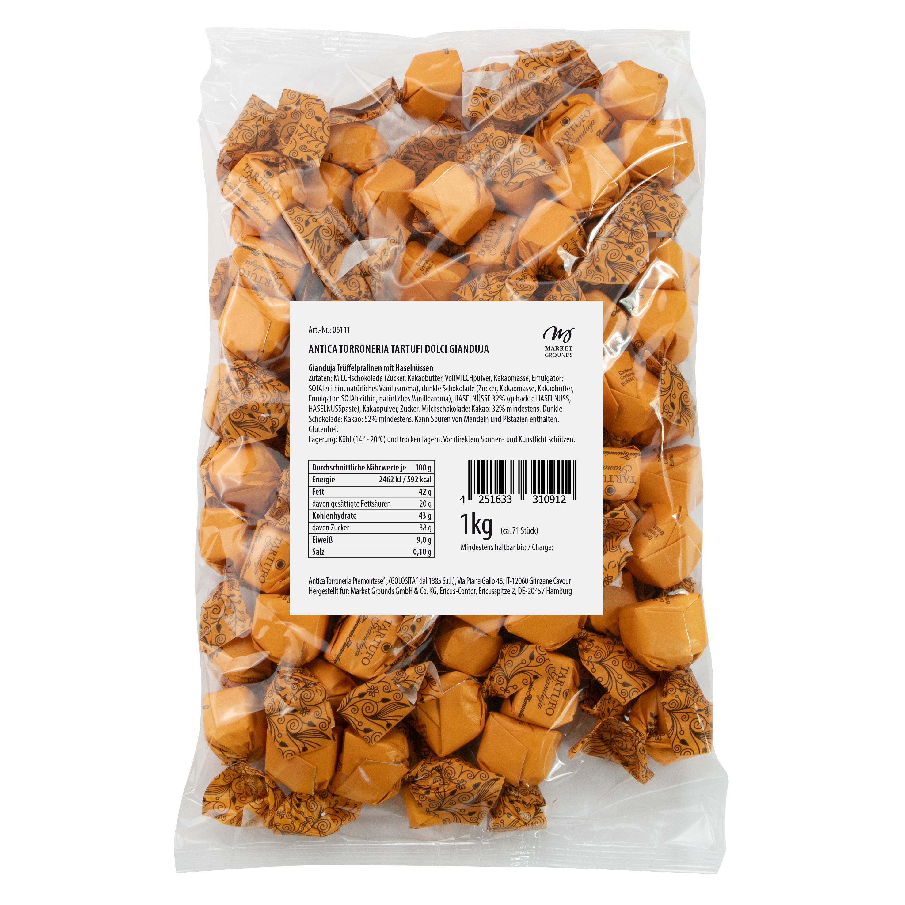 Diese dunkle Trüffelpraline enthält Gianduja-Schokolade und besticht durch den vollen Geschmack der Haselnüsse. Die perfekte Balance zwischen nussiger Fülle und der intensiven Bitterkeit dunkler Schokolade macht diese Praline zu einem exquisiten Genussmoment, den man nicht verpassen sollte.