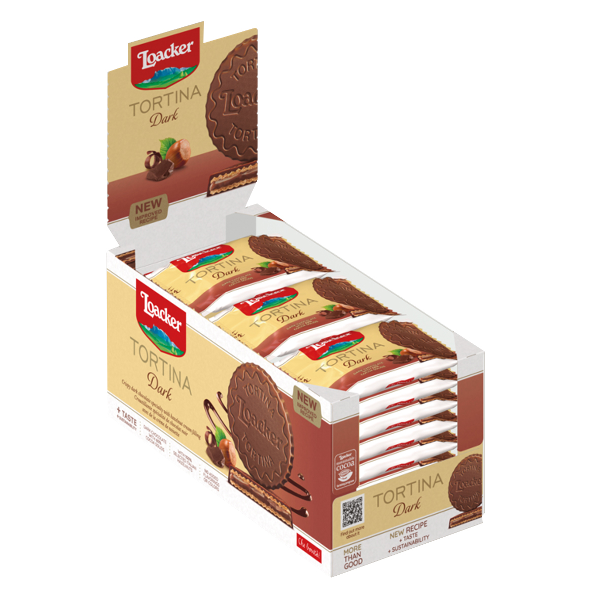 »Tortina Original« von Loacker - eine himmlische Kombination aus zwei knusprigen Waffeln, die von feiner dunkler Schokolade umhüllt und mit einer zartschmelzenden Haselnuss-Nougat-Creme gefüllt sind. Diese Schokoladenspezialität bietet den perfekten Ausgleich zwischen knusprig und cremig und ist ein unwiderstehlicher Genuss für alle Schokoladenliebhaber. Ob als kleine Auszeit am Nachmittag oder als süßer Snack unterwegs - die Tortina Original sorgt immer für einen Moment des Wohlfühlens. Ein wahrer Genuss aus dem Hause Loacker.