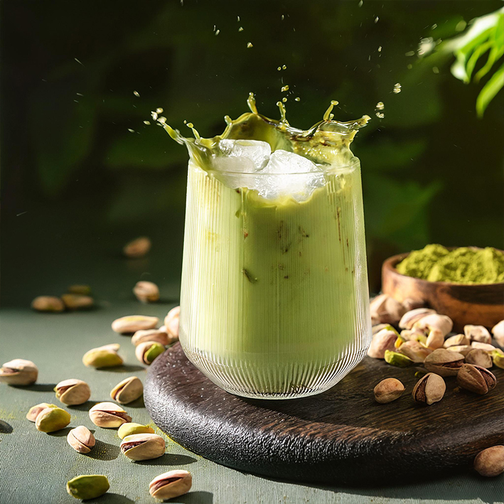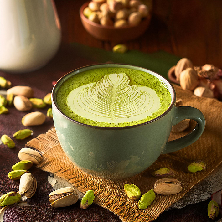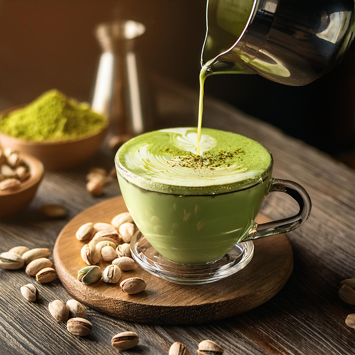 Eine einzigartige Fusion aus nussiger Pistazie und Matcha. Diese Kombination bringt den sanften, herben Geschmack von grünem Tee mit einer leichten Süße der Pistazie zusammen. Einfach mit kalter oder warmer Milch mischen und genießen.